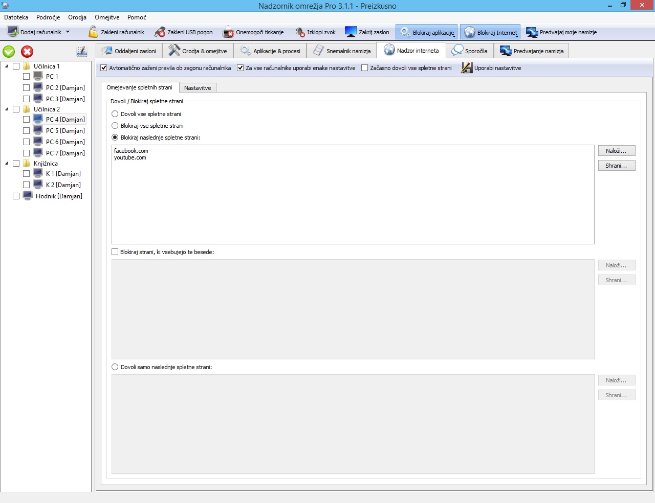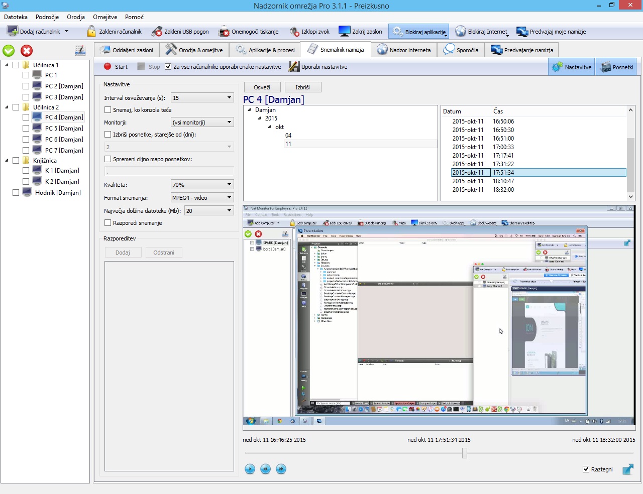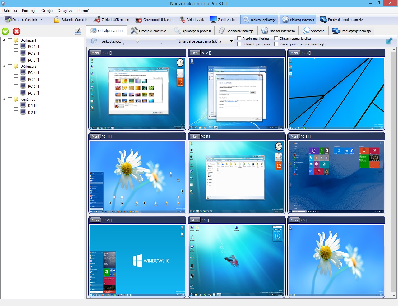 Spodnje zaslonske slike prikazujejo najpomembnejše dele vmesnika: oddaljeni zasloni, prikaz stanja, snemanje in blokade interneta.