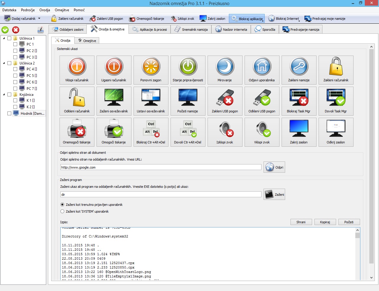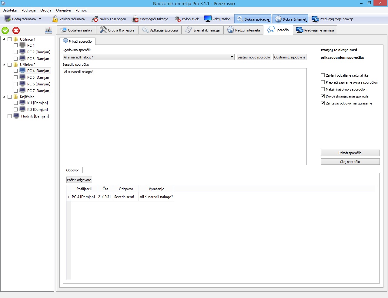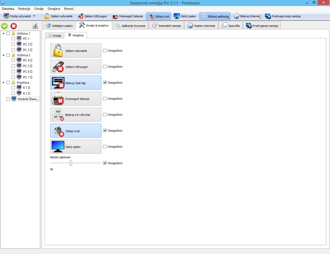 Spodnje zaslonske slike prikazujejo najpomembnejše dele vmesnika: oddaljeni zasloni, prikaz stanja, snemanje in blokade interneta.